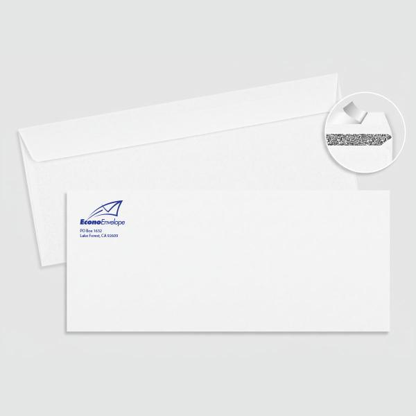 No. 10 Peel n Seal White Printed Envelope, 24# White Wove, with basket weave pattern inside tint for peek-proof security. Standard Business Size Envelope 4-1/8 x 9-1/2. Production time 5 working days plus transit.